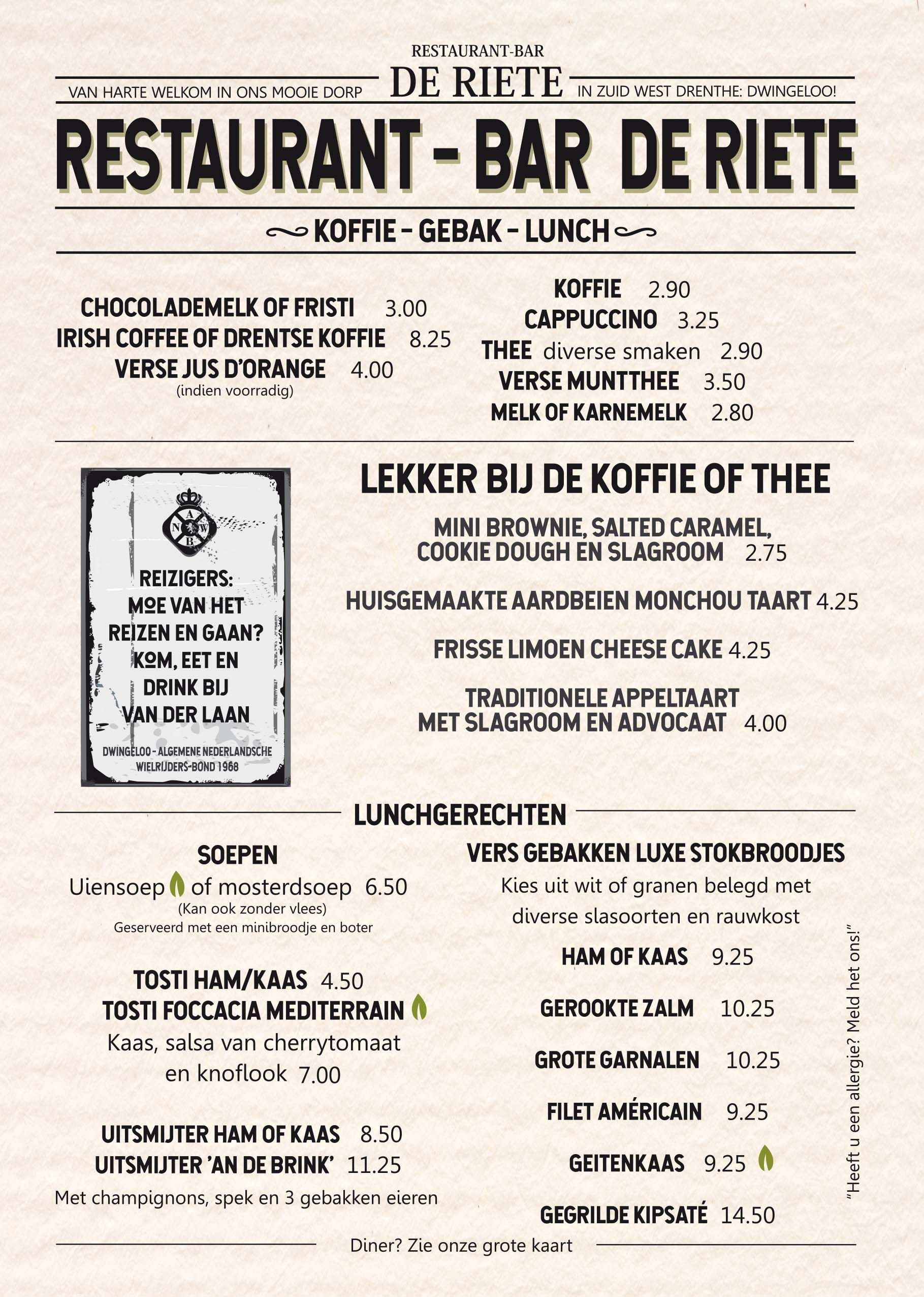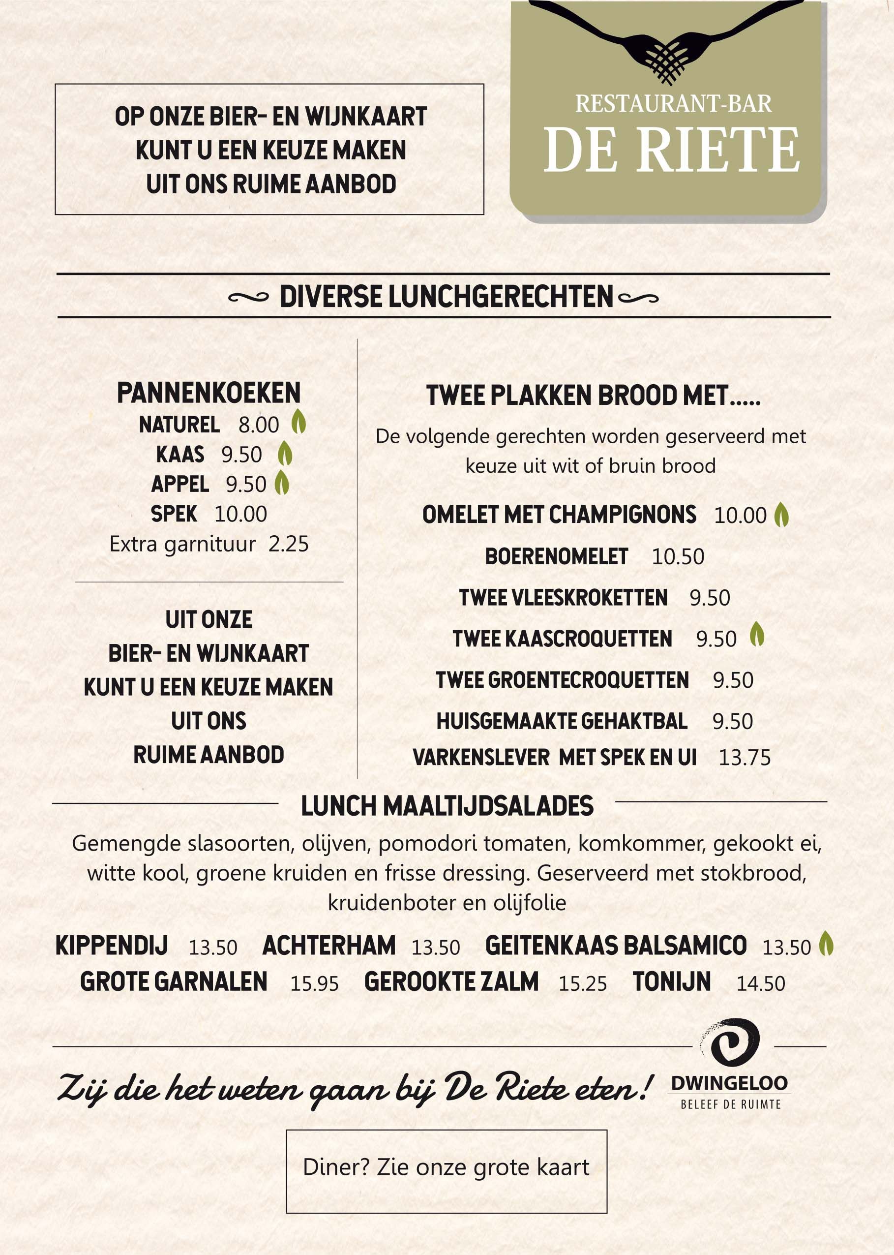 Tijdens een fietstocht of wandeling in de prachtige omgeving is het een mooie onderbreking om te gaan lunchen in Dwingeloo, bij Restaurant-Bar De Riete. Geniet op deze mooie plek aan de gerestaureerde Brink van heerlijke traditionele lunchgerechten als een uitsmijter, een tosti of een belegd stokbroodje. Wat dacht u van de uitsmijter ‘An de Brink’? Dat is een heerlijke uitsmijter met meegebakken spek en uien, een specialiteit van het huis. Bekijk op de website de uitgebreide menukaart om al onze gerechten te bekijken. Lunchen kan bij Restaurant-Bar De Riete in principe tot 17.00 uur.
